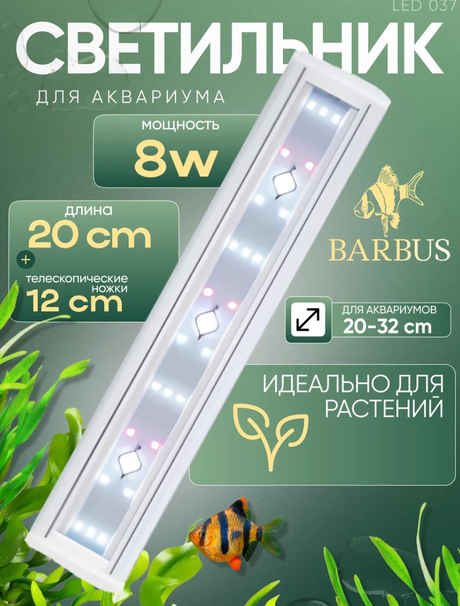 Панорамный аквариум - светильник объемом 20 литров. Характеристики светильника: длина 19 см, мощность 3,5 W, влагозащита ip68, 7 белых светодиодов, установлен на креплении. Размер аквариума 225*255*500 мм, заливной объём 20 литров. Собран из стекла 4мм марки М1.
